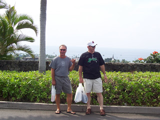 Yesterday, Dennis and I started the day off at an open-air cafe in downtown Kona for breakfast, while Doug was at the dentist. He picked us up, and we made a stop at Wal-Mart for some shorts and tank tops–items we couldn’t buy at home this time of year. You would not believe the view at from the Wal-Mart parking lot–checkout the above picture.